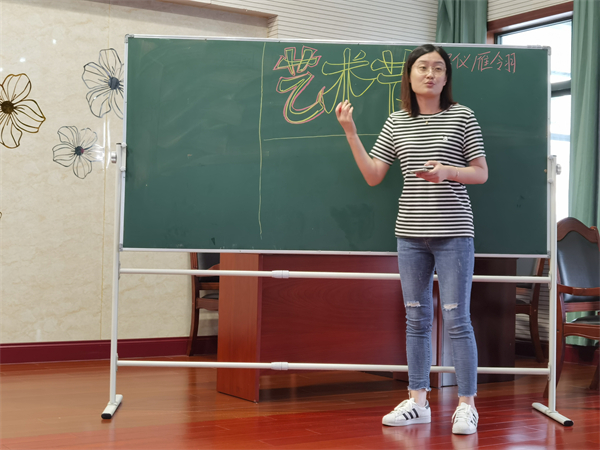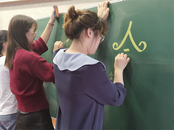 接着,美术张译丹老师和陈晨老师分别围绕主题字书写和设计黑板报的基本要素,结合实例,对如何快速美观地写好主题字、设计好一期黑板报进行深入浅出地讲解。切合实际的教学让班主任们获得了有效的指导与审美的启迪。三位年轻班主任更是活学活用,现场在小黑板上对今日所学进行练习,切实提高了自身设计书写艺术字的水平。