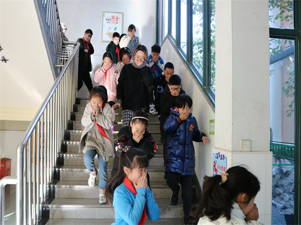 当警报声响起时,全校师生立即进入演练状态,各班班主任组织本班学生迅速有序地按规定路线、地点向外撤离,并指导学生用手捂住口鼻,俯身躲避浓烟。第一时间到达安全地点后,各班整理队伍,清点人数,最后向总指挥李红老师汇报人数。