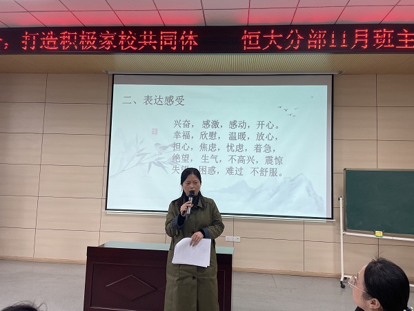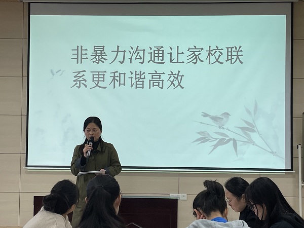 会上,钱颜虹老师开展了讲座《静态文化建设,润物细无声》,从自己多年的班主任经验着手,围绕班级精神展示区、班级特色引领区、阅读成果展示区的打造,向大家传授了班级文化建设的小妙招,打开了班主任老师对于班级文化建设的新思路;王丽亚老师根据自己阅读《非暴力沟通》后的感悟,作了题为《非暴力沟通让,家校联系更和谐高效》的讲座,从非暴力沟通的四要素“观察、感受、需要、请求”入手,配上工作和生活中常见的问题,详细地讲解了作为老师如何运用这四要素与家长沟通,达到家校合作,促进学生成长的目的。