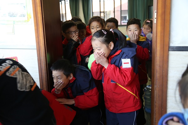 随着警报声的响起,消防安全演练活动正式开始。教室里的学生在教师的指挥下,用手捂住口、鼻,弯腰俯身,贴近地面,迅速而有秩序地撤离到操场安全地带,班主任负责清点人数。整个演习过程快速、有序,达到了预期的效果。
