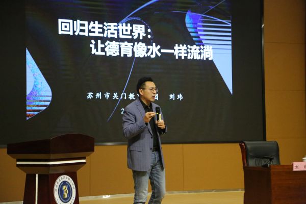 第二天,江苏省特级教师刘玮校长向大家分析了校园德育与儿童生活的割裂、形式化的活动呈现校园德育的浮华与失真及学科化的活动逻辑让校园德育路径变得狭隘与疏离等一系列现象,提出了要在价值定位上,构建从“特色创建”走向“生命成长”;从“道德灌输”走向“文化影响”;从“主客体关系”走向“主体间性”的德育活动,重在引领儿童回归生活世界,让德育像水一样流淌。